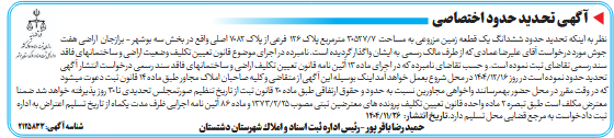 جوش مورد درخواست آقای علیرضا عمادی که از طرف مالک رسمی به ایشان واگذار گردیده است. نامبرده در اجرای موضوع قانون تعیین تکلیف وضعیت اراضی و ساختمانهای فاقد سند رسمی تقاضای ثبت نموده است. و حسب تقاضای نامبرده که در اجرای ماده 13 آئین نامه قانون تعیین تکلیف اراضی و ساختمانهای فاقد سند رسمی درخواست انتشار آگهی تحدید حدود نموده است در روز 16/12/1404 در محل شروع بعمل خواهد آمد اینک بوسیله این آگهی از متقاضی و کلیه صاحبان املاک مجاور طبق ماده 14 قانون ثبت دعوت میشود که در وقت مقرر در محل حضور بهمرسانند واخواهی مجاورین نسبت به حدود و حقوق ارتفاقی طبق ماده 20 قانون ثبت از تاریخ تنظیم صورتمجلس تحدیدی تا 30 روز پذیرفته خواهد شد ضمنا معترض مکلف است طبق تبصره 2 ماده واحده قانون تعیین تکلیف پرونده های معترضین ثبتی مصوب 25/2/1373 و ماده 86 آئین نامه اجرایی ظرف مدت یکماه از تاریخ تسلیم اعتراض به اداره ثبت دادخواست به مرجع قضایی محل تسلیم دارد.تاریخ انتشار: 26/11/1404