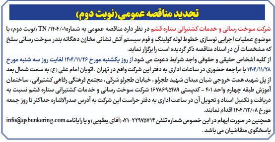 از کلیه اشخاص حقیقی و حقوقی واجد شرایط دعوت می شود از روز یکشنبه مورخ 26/11/1404 لغایت روز سه شنبه مورخ 28/11/1404 با مراجعه حضوری در ساعات اداری به دفتر این شرکت واقع در تهران ، اتوبان امام علی (ع) به سمت شمال بعد از پل شهید همت خروجی شیان میدان شهید طجرلو ، خیابان طجرلو شرقی ، مجتمع فرهنگی رفاهی کشتیرانی ، ساختمان آموزش طبقه چهارم واحد 401 - کدپستی 1678695489 شرکت سوخت رسانی و خدمات کشتیرانی ستاره قشم نسبت به دریافت و تکمیل استاد و تحویل آن در ساعت اداری به دفتر حراست این شرکت به آدرس صدرالاشاره حداکثر تا روز جمعه مورخ 08/12/1404 اقدام نمایند.