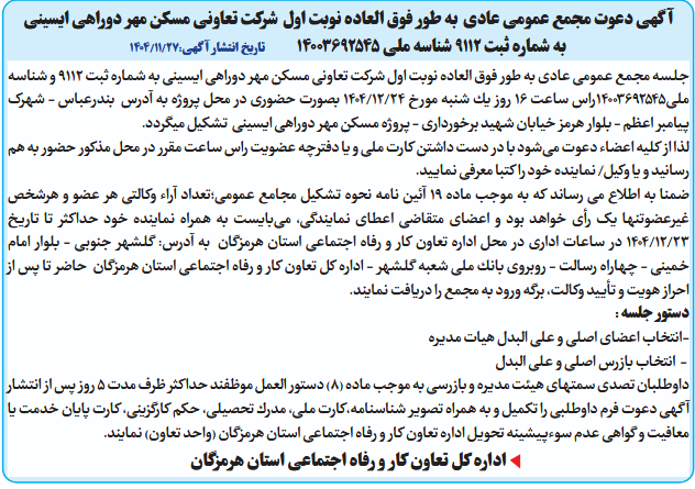 جلسه مجمع عمومی عادی به طور فوق العاده نوبت اول شرکت تعاونی مسكن مهر دوراهی ایسینی به شماره ثبت 9112 و شناسه ملی14003692545راس ساعت 16 روز یك شنبه مورخ 24/12/1404 بصورت حضوری در محل پروژه به آدرس بندرعباس - شهرک پیامبر اعظم - بلوار هرمز خیابان شهید برخورداری - پروژه مسکن مهر دوراهی ایسینی تشکیل میگردد.