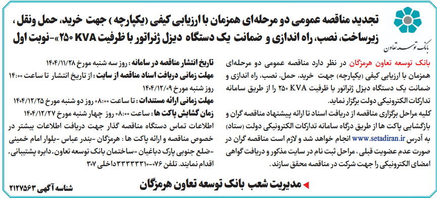 بانک توسعه تعاون هرمزگان در نظر دارد مناقصه عمومی دو مرحلهای همزمان با ارزیابی کیفی (یکپارچه) جهت خرید، حمل، نصب، راه اندازی و ضمانت یک دستگاه دیزل ژنراتور با ظرفیت KVA 250 را از طریق سامانه تدارکات الکترونیکی دولت برگزار نماید.