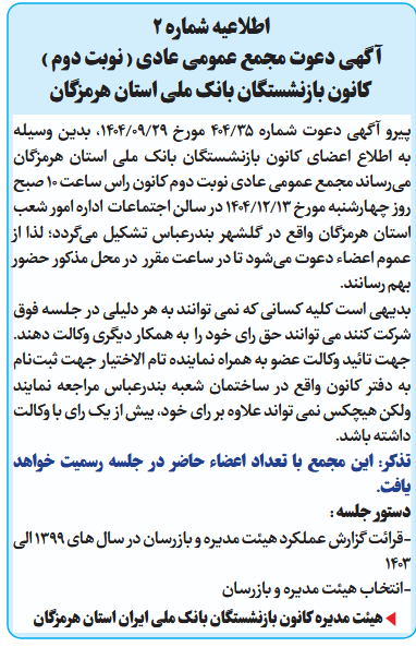 پیرو آگهی دعوت شماره 35/404 مورخ 29/09/1404، بدین وسیله به اطلاع اعضای کانون بازنشستگان بانک ملی استان هرمزگان میرساند مجمع عمومی عادی نوبت دوم کانون راس ساعت 10 صبح روز چهارشنبه مورخ 13/12/1404 در سالن اجتماعات اداره امور شعب استان هرمزگان واقع در گلشهر بندرعباس تشکیل میگردد؛ لذا از عموم اعضاء دعوت میشود تا در ساعت مقرر در محل مذکور حضور بهم رسانند.