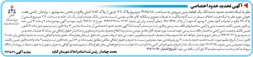 نظر به اینکه تحدید حدود ششدانگ یک قطعه زمین مزروعی به مساحت 88/14065 مترمربع پلاک 127 فرعی از پلاک 7082 اصلی واقع در بخش سه بوشهر - برازجان اراضی هفت جوش مورد نظر به اینکه هیئت اختلاف مستقر در ثبت گناوه؛مالکیت به تصرفات مفروزی و مالکانه آقای هادی مومنی را نسبت به شش دانگ عرصه و اعیان یک باب خانه به مساحت 312 مترمربع قسمتی از پلاک 917 واقع در امامزاده گناوه بخش 6 بوشهر که جهت آن پلاک 11445 /917 منظور گردیده برابر رای شماره 7326 14046032400100 مورخ 18 / 9/1404 تایید نموده و آگهی موضوع ماده 3 و ماده 13 آیین نامه ی قانون تعیین تکلیف وضعیت ثبتی و اراضی ساختمانهای فاقد سند رسمی و قانون ثبت نیز منتشر گردیده لذا آگهی تحدید حدود اختصاصی آن به استناد مادتین 14 و 15 قانون ثبت و تبصره ذیل ماده 13 قانون تعیین تکلیف وضعیت ثبتی اراضی ساختمان فاقد سند رسمی جهت قسمت مورد تصرف آقای هادی مومنی منتشر و به اطلاع متصرف نامبرده و مجاورین و صاحبان حقوق ارتفاقی می رساند که عملیات تحدیدی در صبح مورخ 23 /12/1404 در محل شروع به عمل خواهد آمد.لذا بدینوسیله از متصرف نامبرده و مجاورین دعوت می شود در وقت تعیین شده فوق در محل وقوع ملک حضور یابند واخواهی نسبت به حدود ارتفاعی برابر ماده 20 قانون ثبت از تاریخ تنظیم صورت جلسه تحدید حدود به مدت 30 روز پذیرفته می شود.معترضین نسبت به حدود و حقوق ارتفاقی مکلفن مطابق تبصره ماده ی 86 آیین نامه قانون ثبت و تبصره 2 ماده واحده قانون تعیین تکلیف پرونده معترضین ثبتی مصوب 25/03/73 ظرف مدت یک ماه از تاریخ تسلیم اعتراض کتبی به اداره ثبت دادخواست به مراجع قضائی محل وقوع ملک تسلیم و تصدیق گواهی به جریان دعوی را به جهت ضبط در پرونده از دادگاه مربوط به اخذ و به ثبت تسلیم نمایند و الا حق آنان ساقط می شود./تاریخ انتشار: 28/ 11/1404