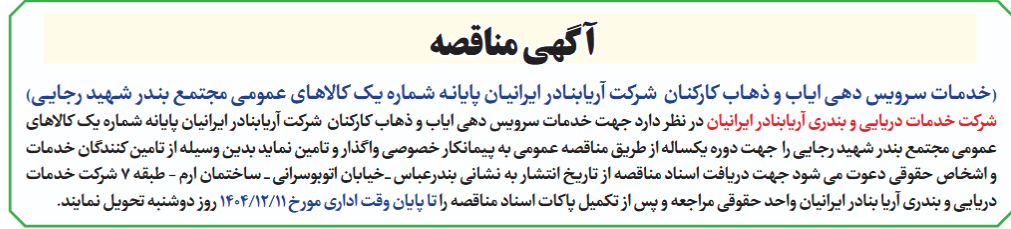 (خدمات سرویس دهی ایاب و ذهاب کارکنان شرکت آریابنادر ایرانیان پایانه شماره یک کالاهای عمومی مجتمع بندر شهید رجایی) شرکت خدمات دریایی و بندری آریابنادر ایرانیان در نظر دارد جهت خدمات سرویس دهی ایاب و ذهاب کارکنان شرکت آریابنادر ایرانیان پایانه شماره یک کالاهای عمومی مجتمع بندر شهید رجایی را جهت دوره یکساله از طریق مناقصه عمومی به پیمانکار خصوصی واگذار و تامین نماید بدین وسیله از تامین کنندگان خدمات و اشخاص حقوقی دعوت می شود جهت دریافت اسناد مناقصه از تاریخ انتشار به نشانی بندرعباس خیابان اتوبوسرانی ساختمان ارم - طبقه 7 شرکت خدمات دریایی و بندری آریا بنادر ایرانیان واحد حقوقی مراجعه و پس از تکمیل پاکات اسناد مناقصه را تا پایان وقت اداری مورخ 11/۱۲/1404 روز دوشنبه تحویل نمایند.