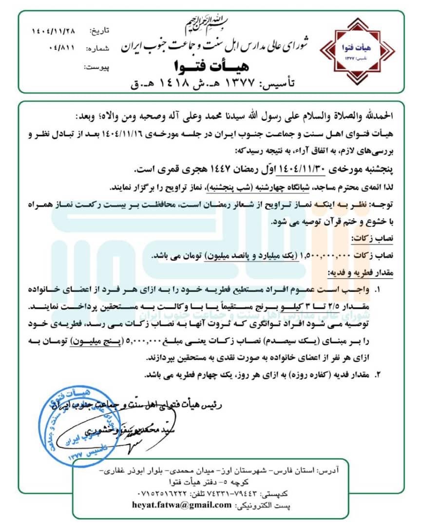 هیأت فتوای اهل سنت و جماعت جنوب ایران در جلسه اخیر خود، پس از بررسیهای لازم، میزان زکات فطریه و فدیه برای ماه رمضان 1447 هـ.ق را اعلام کرد.