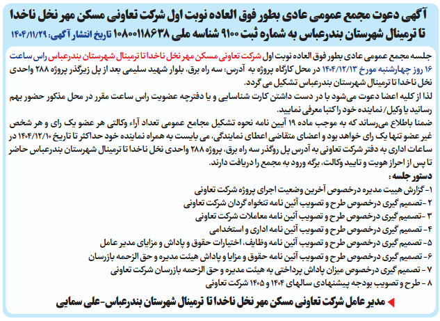 جلسه مجمع عمومی عادی بطور فوق العاده نوبت اول شرکت تعاونی مسکن مهر نخل ناخدا تا ترمینال شهرستان بندرعباس راس ساعت 16 روز چهارشنبه مورخ 13/12/1404 در محل کارگاه پروژه به آدرس: سه راه برق، بلوار شهید سلیمی بعد از پل زیرگذر پروژه 288 واحدی نخل ناخدا تا ترمینال شهرستان بندرعباس تشکیل می گردد.