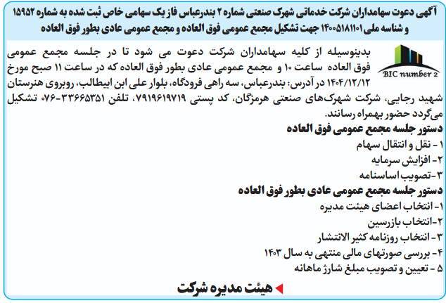 فوق العاده ساعت 10 و مجمع عمومی عادی بطور فوق العاده که در ساعت 11 صبح مورخ 12/12/1404 در آدرس: بندرعباس، سه راهی فرودگاه، بلوار علی ابن ابیطالب، روبروی هنرستان شهید رجایی، شرکت شهرکهای صنعتی هرمزگان، کد پستی ۷۹۱۹۶۱۹۷۱۹، تلفن ۳۳۶۶۵۳۵۱-۰۷۶ تشکیل میگردد حضور بهمراه رسانند.