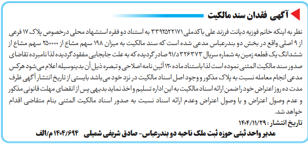 نظر به اینکه خانم فوزیه دیانت فرزند علی باکدملی 3392522171 به استناد دو فقره استشهاد محلی درخصوص پلاک 17 فرعی از 9 اصلی واقع در بخش دو بندرعباس مدعی شده است که سند مالکیت به میزان 198 سهم مشاع از 250000 سهم مشاع از ششدانگ یک قطعه زمین به شماره سریال 326373د/91 صادر گردیده که به علت جابجایی مفقود گردیده لذا نامبرده تقاضای صدور سند مالکیت المثنی نموده است لذا باستناد ماده ۱۲۰ آئین نامه اصلاحی و تبصره ذیل آن بدینوسیله اعلام میشود هرکس مدعی انجام معامله نسبت به پلاک مذکور و وجود اصل اسناد مالکیت در نزد خود میباشد بایستی از تاریخ انتشار آگهی ظرف مدت ده روز اعتراض خود را ضمن ارائه اسناد مالکیت به این اداره تسلیم و اخذ نماید بدیهی پس از انقضای مهلت قانونی مذکور و عدم وصول اعتراض و یا وصول اعتراض وعدم ارائه اسناد نسبت به صدور اسناد مالکیت المثنى بنام متقاضی اقدام