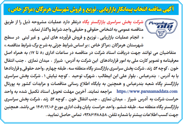 آگهی مناقصه انتخاب پیمانکار بازاریابی ، توزیع و فروش شهرستان هرمزگان (مراکز خاص )
