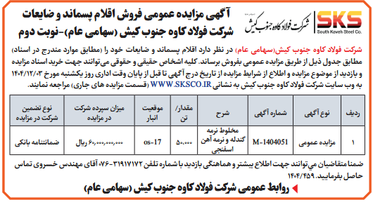 شركت فولاد کاوه جنوب کیش(سهامی عام) در نظر دارد اقلام پسماند و ضایعات خود را (مطابق موارد مندرج در اسناد) مطابق جدول ذیل از طريق مزايده عمومى بفروش برساند. کلیه اشخاص حقیقی و حقوقی میتوانند جهت خرید اسناد مزایده