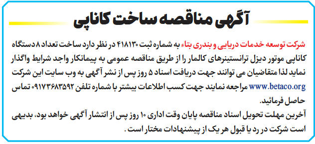 شرکت توسعه خدمات دریایی و بندری بتاء به شماره ثبت 418130 در نظر دارد ساخت تعداد 8دستگاه کاناپی موتور دیزل ترانستینرهای کالمار را از طریق مناقصه عمومی به پیمانکار واجد شرایط واگذار نماید لذا متقاضیان می توانند جهت دریافت اسناد 5 روز پس از نشر آگهی به وب سایت این شرکت www.betaco.org مراجعه نمایند جهت کسب اطلاعات بیشتر با شماره تلفن 09173683592 تماس حاصل فرمائید.
