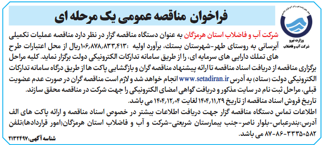 شركت آب و فاضلاب استان هرمزگان به عنوان دستگاه مناقصه گزار در نظر دارد مناقصه عملیات تكمیلی آبرسانی به روستای طهر-شهرستان بستك، برآورد اولیه :106.878.833.413ریال از محل اعتبارات طرح های تملك دارایی های سرمایه ای، را از طریق سامانه تداركات الكترونیكی دولت برگزار نماید. كلیه مراحل برگزاری مناقصه از دریافت اسناد مناقصه تا ارائه پیشنهاد مناقصه گران و بازگشایی پاكت ها از طریق درگاه سامانه تداركات الكترونیكی دولت (ستاد) به آدرس www.setadiran.ir انجام خواهد شد و لازم است مناقصه گران در صورت عدم عضویت قبلی، مراحل ثبت نام در سایت مذكور و دریافت گواهی امضای الكترونیكی را جهت شركت در مناقصه محقق سازند.