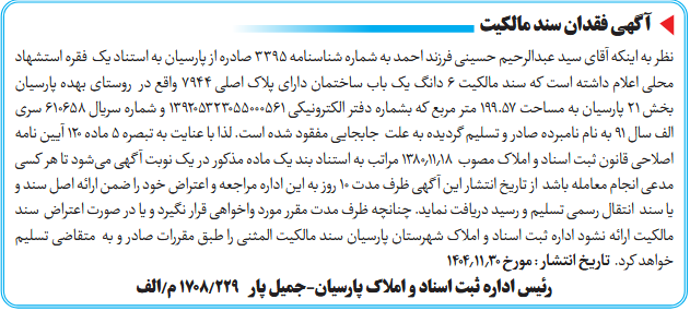 نظر به اینکه آقای سید عبدالرحیم حسینی فرزند احمد به شماره شناسنامه ۳۳۹۵ صادره از پارسیان به استناد یک فقره استشهاد محلی اعلام داشته است که سند مالکیت ۶ دانگ یک باب ساختمان دارای پلاک اصلی ۷۹۴۴ واقع در روستای بهده پارسیان بخش ۲۱ پارسیان به مساحت ۱۹۹.۵۷ متر مربع که بشماره دفتر الکترونیکی 139205323055000561 و شماره سریال ۶۱۰۶۵۸ سری الف سال ۹۱ به نام نامبرده صادر و تسلیم گردیده به علت جابجایی مفقود شده است. لذا با عنایت به تبصره ۵ ماده ۱۲۰ آیین نامه اصلاحی قانون ثبت اسناد و املاک مصوب ۱۳۸۰٫۱۱٫۱۸ مراتب به استناد بند یک ماده مذکور در یک نوبت آگهی میشود تا هر کسی مدعی انجام معامله باشد از تاریخ انتشار این آگهی ظرف مدت ۱۰ روز به این اداره مراجعه و اعتراض خود را ضمن ارائه اصل سند و یا سند انتقال رسمی تسلیم و رسید دریافت نماید. چنانچه ظرف مدت مقرر مورد واخواهی قرار نگیرد و یا در صورت اعتراض سند مالکیت ارائه نشود اداره ثبت اسناد و املاک شهرستان پارسیان سند مالکیت المثنی را طبق مقررات صادر و به متقاضی تسلیم خواهد کرد. تاریخ انتشار : مورخ ۱۴۰۴٫۱۱٫30