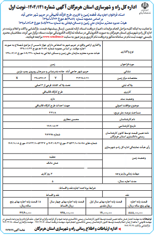 اسناد فراخوان اجاره یک قطعه زمین با کاربری طرح کارگاه قالیبافی در حریم شهر حاجی آبادنوبت اول