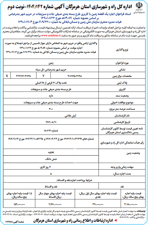 اسناد فراخوان اجاره یک قطعه زمین با کاربری نوبت دوم طرح بسته بندی صیفی جات و سبزیجات در حریم شهر بندرعباس