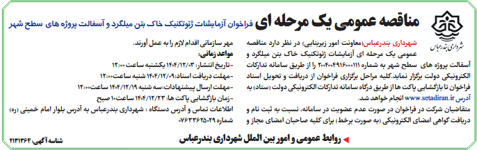شهرداری بندرعباس(معاونت امور زیربنایی) در نظر دارد مناقصه عمومی یک مرحله ای آزمایشات ژئوتکنیک خاک بتن میلگرد و آسفالت پروژه های سطح شهر به شماره 2004004916000111 را از طریق سامانه تدارکات الکترونیکی دولت برگزار نماید.کلیه مراحل برگزاری فراخوان از دریافت و تحویل اسناد فراخوان تا بازگشایی پاکت ها از طریق درگاه سامانه تدارکات الکترونیکی دولت (ستاد) به آدرس www.setadiran.ir انجام خواهد شد.