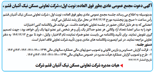 بدینوسیله به اطلاع می رساند جلسه مجمع عمومی عادی بطور فوق العاده ( نوبت اول ) شرکت تعاونی مسکن نیک آشیان قشم رأس ساعت 10 صبح روز پنجشنبه مورخ 14/12/1404 در محل مرکز رشد تشکیل می گردد.