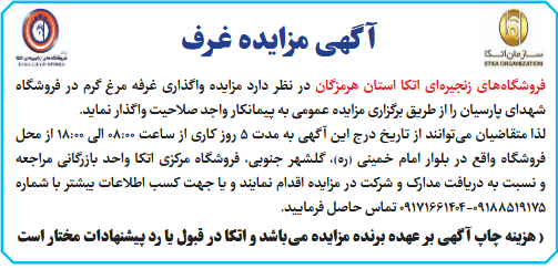 لذا متقاضیان میتوانند از تاریخ درج این آگهی به مدت 5 روز کاری از ساعت 08:00 الی 18:00 از محل فروشگاه واقع در بلوار امام خمینی (ره)، گلشهر جنوبی، فروشگاه مرکزی اتکا واحد بازرگانی مراجعه و نسبت به دریافت مدارک و شرکت در مزایده اقدام نمایند و یا جهت کسب اطلاعات بیشتر با شماره 09188519175-09171661404 تماس حاصل فرمایید.