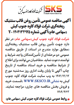 شركت فولاد کاوه جنوب کیش(سهامی عام) در نظر دارد جهت تأمین روغن قالب سنتتیک ریختهگری (مطابق موارد مندرج در اسناد) از طريق مناقصه عمومى دو مرحلهای از تأمینکنندگان واجد شرایط و توانمند دعوت نماید. متقاضیان میتوانند برای اطلاع از شرایط مناقصه و خرید اسناد مناقصه از تاریخ چاپ آگهی تا پایان وقت اداری روز سهشنبه مورخ 12/12/1404 به وب سایت شرکت فولاد کاوه جنوب کیش به نشانی WWW.SKSCO.IR (قسمت خرید و فروش بخش مناقصه های جاری) مراجعه نمایند. 463/1404