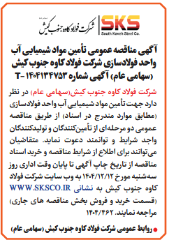شركت فولاد کاوه جنوب کیش(سهامی عام) در نظر دارد جهت تأمین مواد شیمیایی آب واحد فولادسازی (مطابق موارد مندرج در اسناد) از طريق مناقصه عمومى دو مرحلهای از تأمینکنندگان و تولیدکنندگان واجد شرایط و توانمند دعوت نماید. متقاضیان میتوانند برای اطلاع از شرایط مناقصه و خرید اسناد مناقصه از تاریخ چاپ آگهی تا پایان وقت اداری روز سهشنبه مورخ 12/12/1404 به وب سایت شرکت فولاد کاوه جنوب کیش به نشانی WWW.SKSCO.IR (قسمت خرید و فروش بخش مناقصه های جاری) مراجعه نمایند. 462/1404