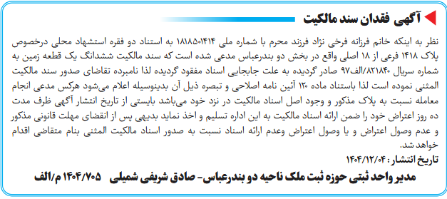 نظر به اینکه خانم فرزانه فرخی نژاد فرزند محرم با شماره ملی 1818501414 به استناد دو فقره استشهاد محلی درخصوص پلاک 1418 فرعی از 18 اصلی واقع در بخش دو بندرعباس مدعی شده است که سند مالکیت ششدانگ یک قطعه زمین به شماره سریال 821840/الف97 صادر گردیده به علت جابجایی اسناد مفقود گردیده لذا نامبرده تقاضای صدور سند مالکیت المثنی نموده است لذا باستناد ماده ۱۲۰ آئین نامه اصلاحی و تبصره ذیل آن بدینوسیله اعلام میشود هرکس مدعی انجام معامله نسبت به پلاک مذکور و وجود اصل اسناد مالکیت در نزد خود میباشد بایستی از تاریخ انتشار آگهی ظرف مدت ده روز اعتراض خود را ضمن ارائه اسناد مالکیت به این اداره تسلیم و اخذ نماید بدیهی پس از انقضای مهلت قانونی مذکور