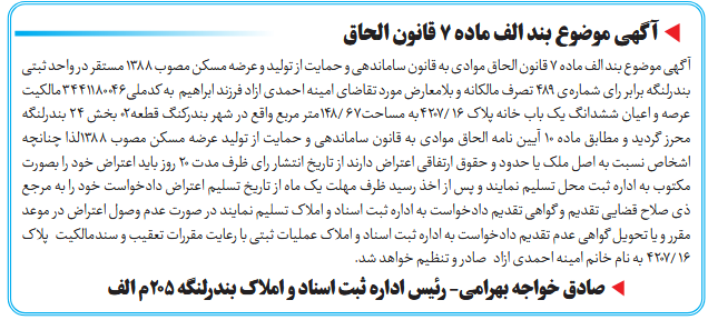 آگهی موضوع بند الف ماده ۷ قانون الحاق موادی به قانون ساماندهی و حمایت از تولید و عرضه مسکن مصوب ۱۳۸۸ مستقر در واحد ثبتی بندرلنگه برابر رای شمارهی 489 تصرف مالکانه و بلامعارض مورد تقاضای امینه احمدی ازاد فرزند ابراهیم به کدملی3441180046مالکیت عرصه و اعیان ششدانگ یک باب خانه پلاک 16 /4207به مساحت67 /148متر مربع واقع در شهر بندرکنگ قطعه02 بخش ۲۴ بندرلنگه محرز گردید و مطابق ماده ۱۰ آیین نامه الحاق موادی به قانون ساماندهی و حمایت از تولید عرضه مسکن مصوب ۱۳۸۸لذا چنانچه اشخاص نسبت به اصل ملک یا حدود و حقوق ارتفاقی اعتراض دارند از تاریخ انتشار رای ظرف مدت ۲۰ روز باید اعتراض خود را بصورت مکتوب به اداره ثبت محل تسلیم نمایند و پس از اخذ رسید ظرف مهلت یک ماه از تاریخ تسلیم اعتراض دادخواست خود را به مرجع ذی صلاح قضایی تقدیم و گواهی تقدیم دادخواست به اداره ثبت اسناد و املاک تسلیم نمایند در صورت عدم وصول اعتراض در موعد مقرر و یا تحویل گواهی عدم تقدیم دادخواست به اداره ثبت اسناد و املاک عملیات ثبتی با رعایت مقررات تعقیب و سندمالکیت پلاک 16 /4207 به نام خانم امینه احمدی ازاد صادر و تنظیم خواهد شد.