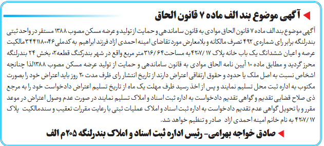 آگهی موضوع بند الف ماده ۷ قانون الحاق موادی به قانون ساماندهی و حمایت از تولید و عرضه مسکن مصوب ۱۳۸۸ مستقر در واحد ثبتی بندرلنگه برابر رای شمارهی 492 تصرف مالکانه و بلامعارض مورد تقاضای امینه احمدی ازاد فرزند ابراهیم به کدملی3441180046مالکیت عرصه و اعیان ششدانگ یک باب خانه پلاک 17 /4207به مساحت64 /316متر مربع واقع در شهر بندرکنگ قطعه02 بخش ۲۴ بندرلنگه محرز گردید و مطابق ماده ۱۰ آیین نامه الحاق موادی به قانون ساماندهی و حمایت از تولید عرضه مسکن مصوب ۱۳۸۸لذا چنانچه اشخاص نسبت به اصل ملک یا حدود و حقوق ارتفاقی اعتراض دارند از تاریخ انتشار رای ظرف مدت ۲۰ روز باید اعتراض خود را بصورت مکتوب به اداره ثبت محل تسلیم نمایند و پس از اخذ رسید ظرف مهلت یک ماه از تاریخ تسلیم اعتراض دادخواست خود را به مرجع ذی صلاح قضایی تقدیم و گواهی تقدیم دادخواست به اداره ثبت اسناد و املاک تسلیم نمایند در صورت عدم وصول اعتراض در موعد مقرر و یا تحویل گواهی عدم تقدیم دادخواست به اداره ثبت اسناد و املاک عملیات ثبتی با رعایت مقررات تعقیب و سندمالکیت پلاک 17 /4207 به نام خانم امینه احمدی ازاد صادر و تنظیم خواهد شد.