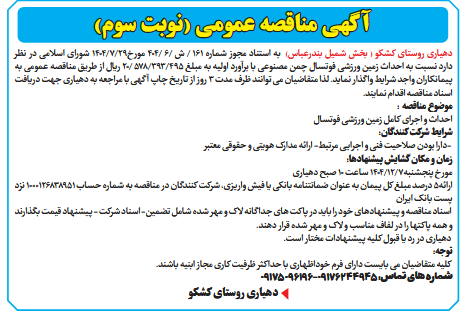 دهیاری روستای کشکو ( بخش شمیل بندرعباس) به استناد مجوز شماره 161 / ش /6 /404 مورخ29/7/1404 شورای اسلامی در نظر دارد نسبت به احداث زمین ورزشی فوتسال چمن مصنوعی با برآورد اولیه به مبلغ 495/393/578 /20 ریال از طریق مناقصه عمومی به پیمانکاران واجد شرایط واگذار نماید. لذا متقاضیان می توانند ظرف مدت 3 روز از تاریخ چاپ آگهی با مراجعه به دهیاری جهت دریافت اسناد مناقصه اقدام نمایند.