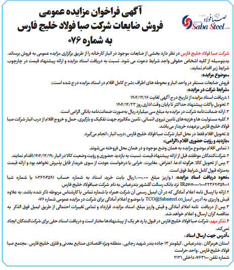 آگهی فراخوان مزایده عمومیفروش ضایعات شرکت صبا فولاد خلیج فارس