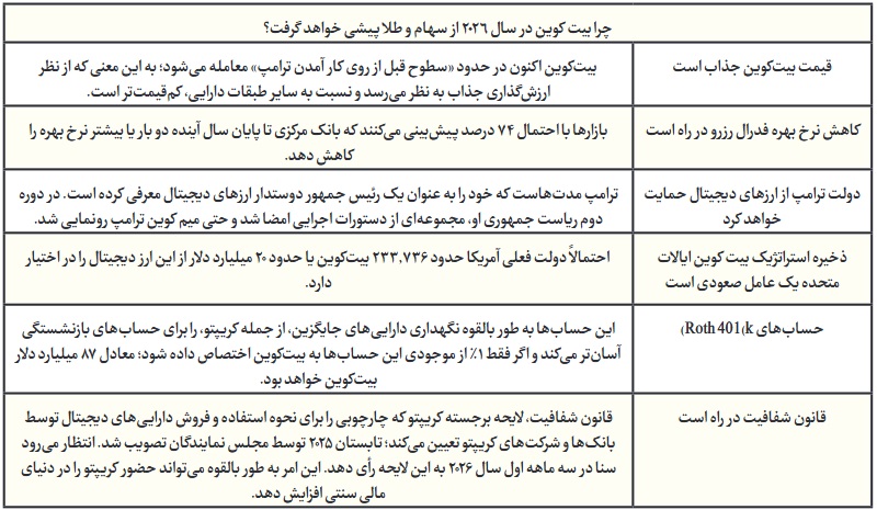 درست است که نمیتوان انکار کرد پس از دو سال بازدهی بیش از ۱۰۰ درصدی، در سال 2025 بیت کوین با کاهش قابل توجه سرمایهگذاران را ناامید کرد اما برخی تحلیلگران معتقدند به دلیل کاهش نرخ بهره فدرال رزرو آمریکا، حمایت دولت ترامپ از کریپتو و قانون شفافیت ارزهای دیجیتال در ادامه سال ۲۰۲۶ شاهد بازگشت قوی بیت کوین و بازار کریپتو خواهیم بود. گفتنی است؛ بیتکوین در ماه نوامبر وارد یک فاز نزولی شد و از اوج خود در حدود ۱۲۶۰۰۰ دلار، ۴۴ درصد کاهش یافت. تحلیلگران، بخش عمدهای از عملکرد ضعیف بیتکوین در سال ۲۰۲۵ را به «حبابهای منفرد» و «عدم تعادل موقت اهرم» در بازار ارزهای دیجیتال نسبت دادهاند و معتقدند این موضوع در سال 2026 ادامهدار نخواهد بود. گفتنی است؛ بسیاری، این قیمتها را فرصتی برای خرید عنوان کردهاند و معتقدند وقتی قیمتها و عوامل بنیادی در جهت مخالف حرکت میکنند؛ فرصت خرید ایجاد میشود. بر همین اساس، پیشبینی میشود؛ بیتکوین در سال ۲۰۲۶ از شاخصهای سهام و طلا پیشی بگیرد.