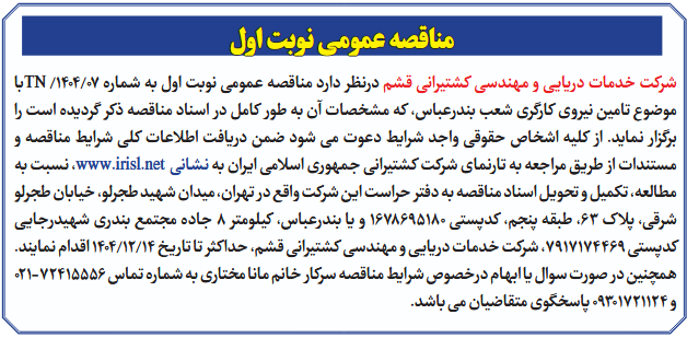 شرکت خدمات دریایی و مهندسی کشتیرانی قشم درنظر دارد مناقصه عمومی نوبت اول به شماره 07/1404/ TNبا موضوع تامین نیروی کارگری شعب بندرعباس، که مشخصات آن به طور کامل در اسناد مناقصه ذکر گردیده است را برگزار نماید. از کلیه اشخاص حقوقی واجد شرایط دعوت می شود ضمن دریافت اطلاعات کلی شرایط مناقصه و مستندات از طریق مراجعه به تارنمای شرکت کشتیرانی جمهوری اسلامی ایران به نشانی www.irisl.net، نسبت به مطالعه، تکمیل و تحویل اسناد مناقصه به دفتر حراست این شرکت واقع در تهران، میدان شهید طجرلو، خیابان طجرلو شرقی، پلاک 63، طبقه پنجم، کدپستی 1678695180 و یا بندرعباس، کیلومتر 8 جاده مجتمع بندری شهیدرجایی کدپستی 7917174469، شرکت خدمات دریایی و مهندسی کشتیرانی قشم، حداکثر تا تاریخ 14/12/1404 اقدام نمایند. همچنین در صورت سوال یا ابهام درخصوص شرایط مناقصه سرکار خانم مانا مختاری به شماره تماس 72415556-021 و 09301721124 پاسخگوی متقاضیان می باشد.