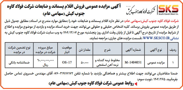 شركت فولاد کاوه جنوب کیش(سهامی عام) در نظر دارد اقلام پسماند و ضایعات خود را (مطابق موارد مندرج در اسناد) مطابق جدول ذیل از طريق مزايده عمومى بفروش برساند. کلیه اشخاص حقیقی و حقوقی میتوانند جهت خرید اسناد مزایده و بازدید از موضوع مزایده و اطلاع از شرایط مزایده از تاریخ درج آگهی تا قبل از پایان وقت اداری روز پنجشنبه مورخ 07/12/1404 به وب سایت شرکت فولاد کاوه جنوب کیش به نشانی WWW.SKSCO.IR (قسمت مزایده های جاری) مراجعه نمایند.