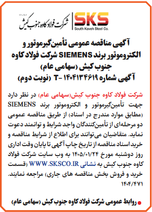 شركت فولاد کاوه جنوب کیش(سهامی عام) در نظر دارد جهت تأمینگیرموتور و الکتروموتور برند SIEMENS (مطابق موارد مندرج در اسناد) از طريق مناقصه عمومى دو مرحلهای از تأمینکنندگان واجد شرایط و توانمند دعوت نماید. متقاضیان میتوانند برای اطلاع از شرایط مناقصه و خرید اسناد مناقصه از تاریخ چاپ آگهی تا پایان وقت اداری روز دوشنبه مورخ 24/01/1405 به وب سایت شرکت فولاد کاوه جنوب کیش به نشانی WWW.SKSCO.IR (قسمت خرید و فروش بخش مناقصه های جاری) مراجعه نمایند. 471/1404
