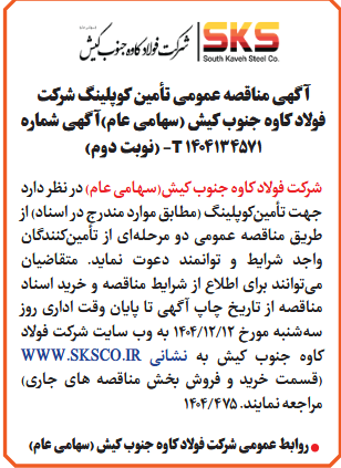 شركت فولاد کاوه جنوب کیش(سهامی عام) در نظر دارد جهت تأمینکوپلینگ (مطابق موارد مندرج در اسناد) از طريق مناقصه عمومى دو مرحلهای از تأمینکنندگان واجد شرایط و توانمند دعوت نماید. متقاضیان میتوانند برای اطلاع از شرایط مناقصه و خرید اسناد مناقصه از تاریخ چاپ آگهی تا پایان وقت اداری روز سهشنبه مورخ 12/12/1404 به وب سایت شرکت فولاد کاوه جنوب کیش به نشانی WWW.SKSCO.IR (قسمت خرید و فروش بخش مناقصه های جاری) مراجعه نمایند. 475/1404