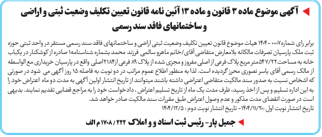 برابر رای شماره0007 -1404 هیات موضوع قانون تعیین تکلیف وضعیت ثبتی اراضی و ساختمانهای فاقد سند رسمی مستقر در واحد ثبتی حوزه ثبت ملک پارسیان تصرفات مالكانه بلامعارض متقاضی آقای/خانم ماهرو سالمی فرزند محمد بشماره شناسنامه1 صادره از کوشکنار در یکباب خانه به مساحت22/547متر مربع پلاک فرعی از اصلی مفروز و مجزی شده از پلاک 89 فرعی از2184اصلی واقع در پارسیان خریداری مع الواسطه از مالک رسمی آقای یاسر نصوری محرز گردیده است. لذا به منظور اطلاع عموم مراتب در دو نوبت به فاصله ۱۵ روز آگهی می شود در صورتی که اشخاص نسبت به صدور سند مالکیت متقاضی اعتراضی داشته باشند میتوانند از تاریخ انتشار اولین آگهی به مدت دو ماه اعتراض خود را به این اداره تسلیم و پس از اخذ رسید، ظرف مدت یک ماه از تاریخ تسلیم اعتراض ، دادخواست خود را به مراجع قضایی تقدیم نمایند. بدیهی است در صورت انقضای مدت مذکور و عدم وصول اعتراض طبق مقررات سند مالکیت صادر خواهد شد.