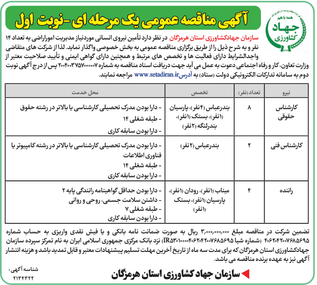 سازمان جهادکشاورزی استان هرمزگان در نظر دارد تأمین نیروی انسانی موردنیاز مدیریت اموراراضی به تعداد 14 نفر و به شرح ذیل را از طریق برگزاری مناقصه عمومی به بخش خصوصی واگذار نماید. لذا از شرکت های متقاضی واجدالشرایط دارای فعالیت ها و تخصص های مرتبط و همچنین دارای گواهی ایمنی و تأیید صلاحیت معتبر از وزارت تعاون، کار و رفاه اجتماعی دعوت به عمل می آید جهت دریافت اسناد مناقصه به شماره 2004003757000007 پس از درج آگهی نوبت دوم به سامانه تدارکات الکترونیکی دولت (ستاد) به آدرسwww.setadiran.ir مراجعه نمایند.