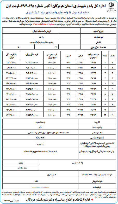 اسناد مزایده فروش 11 واحد تجاری واقع در شهر میناب شهرک المهدی نوبت اول