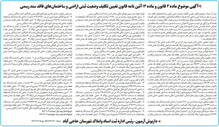برابر آراء هیات موضوع قانون تعیین تكلیف وضعیت ثبتی اراضی وساختمانهای فاقد سند رسمی مستقر در واحد ثبتی حاجی آباد تصرفات مالكانه وبلامعارض متقاضیان محرز گردیده است لذا مشخصات متقاضیان وپلاك مورد تقاضا به شرح زیرجهت اطلاع عموم در دو نوبت به فاصله 15 روز آْگهی می شود در صورتی كه هركس نسبت به صدور سند مالكیت بنام متقاضیان اعتراض داشته باشد می تواند از تاریخ انتشار اولین آگهی به مدت دو ماه اعتراض خود را كتباً به اداره ثبت اسناد واملاك محل تسلیم وپس از اخذ رسید ظرف مدت یكماه از تاریخ تسلیم اعتراض دادخواست خود را به مراجع محترم قضایی تقدیم وگواهی تقدیم دادخواست را به اداره ثبت محل تحویل نماید، در هر حال صدور سند مالكیت جدید مانع مراجعه متضرر به دادگاه نخواهد شد %