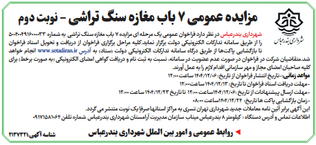 شهرداری بندرعباس در نظر دارد فراخوان عمومی یک مرحله ای مزایده 7 باب مغازه سنگ تراشی به شماره 5004004916000033 را از طریق سامانه تدارکات الکترونیکی دولت برگزار نماید.کلیه مراحل برگزاری فراخوان از دریافت و تحویل اسناد فراخوان تا بازگشایی پاکتها از طریق درگاه سامانه تدارکات الکترونیکی دولت (ستاد) به آدرس www.setadiran.ir انجام خواهد شد.متقاضیان شرکت در فراخوان در صورت عدم عضویت در سامانه، نسبت به ثبت نام و دریافت گواهی امضای الکترونیکی (به صورت برخط) برای کلیه صاحبان امضای مجاز و مهر سازمانی اقدام لازم را به عمل آورند.