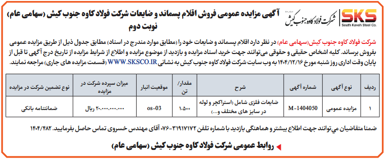 شركت فولاد کاوه جنوب کیش(سهامی عام) در نظر دارد اقلام پسماند و ضایعات خود را (مطابق موارد مندرج در اسناد) مطابق جدول ذیل از طريق مزايده عمومى بفروش برساند. کلیه اشخاص حقیقی و حقوقی میتوانند جهت خرید اسناد مزایده و بازدید از موضوع مزایده و اطلاع از شرایط مزایده از تاریخ درج آگهی تا قبل از پایان وقت اداری روز شنبه مورخ 16/12/1404 به وب سایت شرکت فولاد کاوه جنوب کیش به نشانی WWW.SKSCO.IR (قسمت مزایده های جاری) مراجعه نمایند.