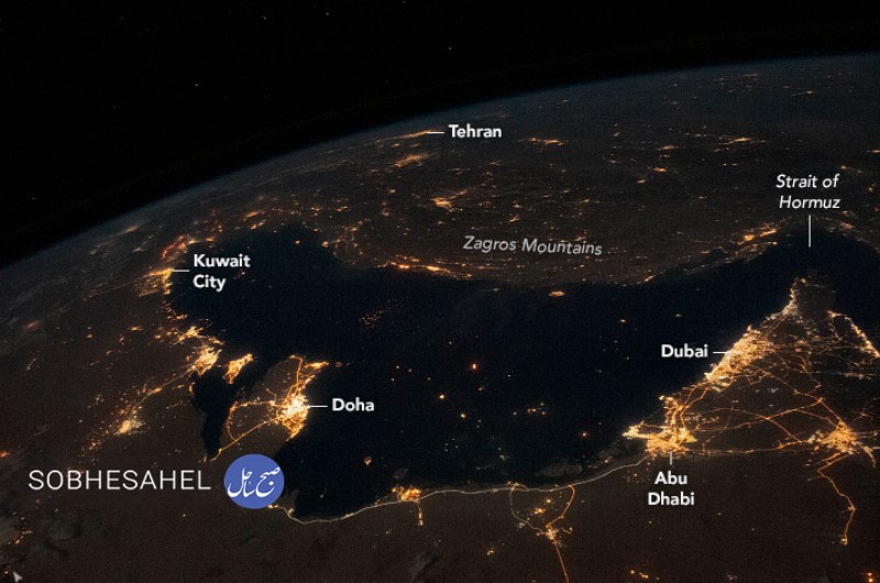 خلیج فارس مرکز این عکس است که توسط یک فضانورد از ایستگاه فضایی بینالمللی (ISS) گرفته شده است. به گزارش صبح ساحل، چراغهای شب، شهرهای بزرگتر و بزرگراههای بحرین، ایران، عراق، کویت، قطر، عربستان سعودی و امارات متحده عربی را نشان میدهد. درخشانترین چراغها در امتداد خط ساحلی جنوبی و غربی متمرکز شدهاند، جایی که شهرهای بزرگ کویت، دوحه، ابوظبی و دبی خودنمایی میکنند. چندین شهر بندری کوچکتر در سواحل شمالی در دامنه کوههای زاگرس قرار گرفته اند. چراغهایی که در آبهای تاریک خلیج فارس به شکل نقطه دیده میشوند ، کشتیهایی را نشان میدهد که از یکی از مسیرهای اصلی تجارت جهان عبور می کنند. باریکترین قسمت، تنگه هرمز است که خلیج فارس را به خلیج عمان متصل می کند. عرض این تنگه بین 39 و 96 کیلومتر (21 تا 90 مایل دریایی) متغیر است و نشان دهنده یک نقطه مهم در شبکه تجارت جهانی است که میلیون ها بشکه نفت خام و فرآورده های نفتی در روز را در منطقه عبور میدهد. این تصویر در تاریخ 24 ژانویه 2021 در سایت ناسا منتشر شده است.